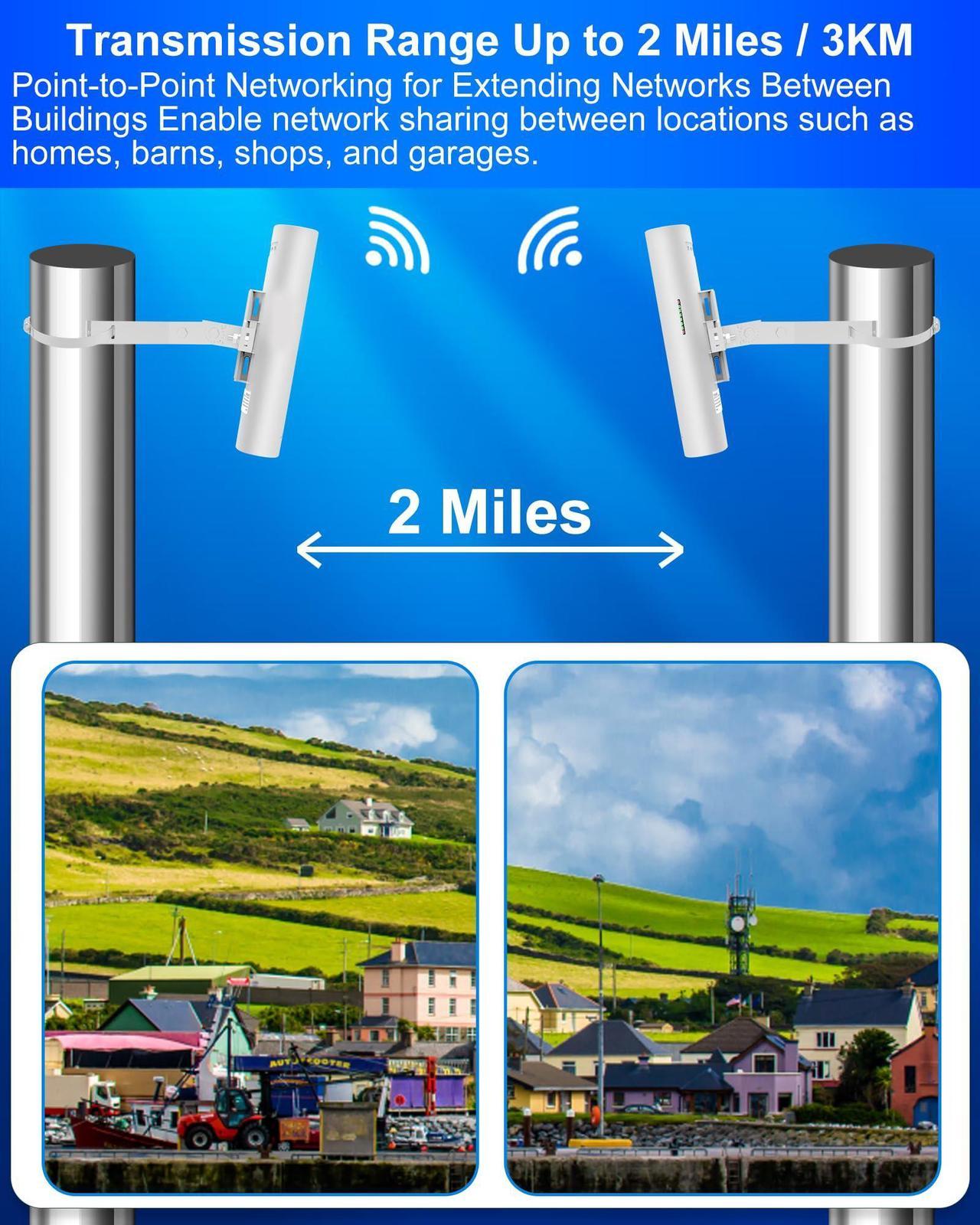 5.8GHz / 300Mbps High-Speed Transmission: This wireless bridge utilize advanced 5.8GHz 300Mbps wireless technology and are equipped with a 12dBi high-gain antenna. With a maximum transmission range of up to 2 miles (Barrier-free), they offer reliable and fast connectivity. The built-in 100Mbps LAN port ensures seamless wired network speed, making it ideal for point-to-point internet access sharing, remote IP camera surveillance, or remote network Wi-Fi access.