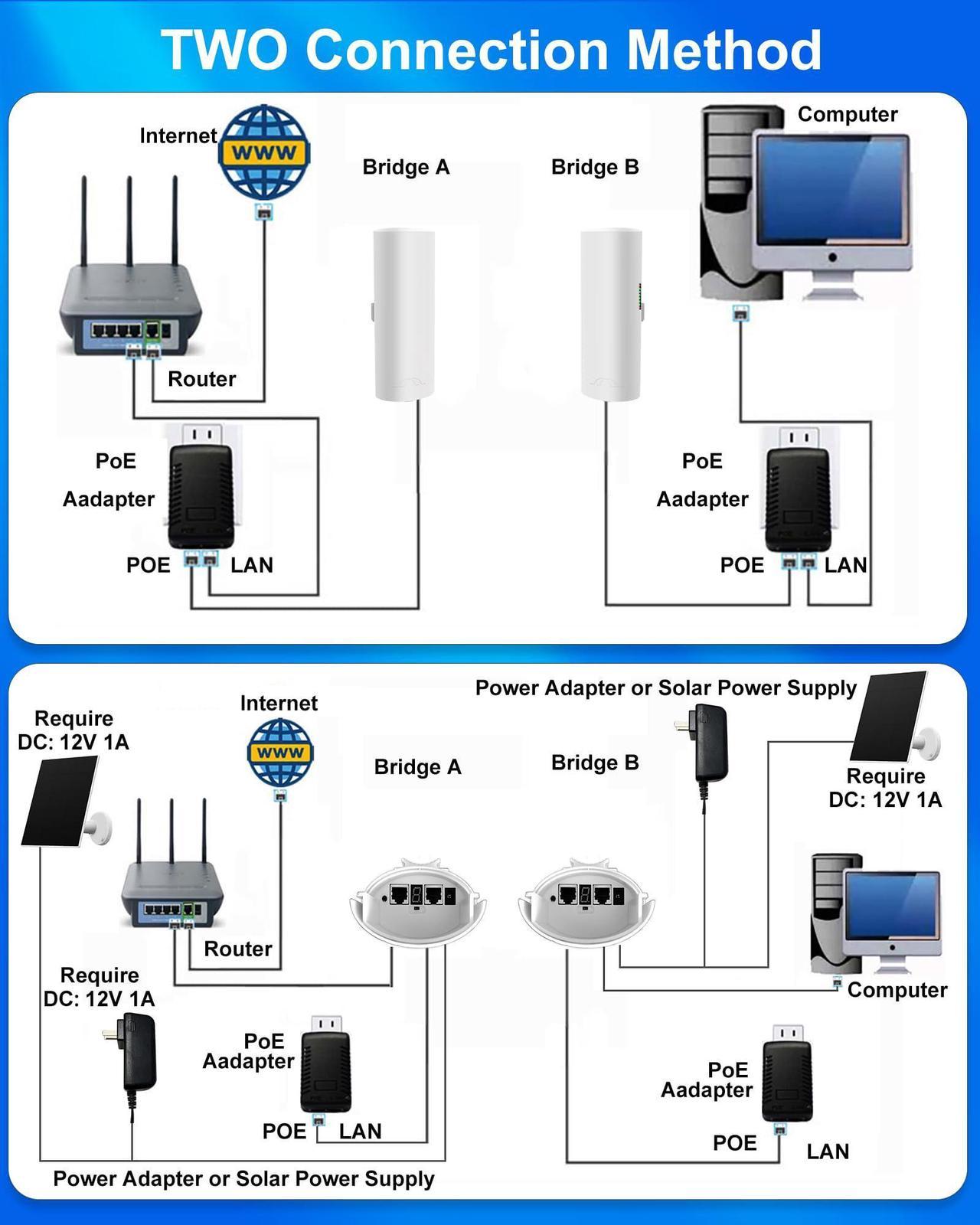 PTMP Pre-programmed for Easy Setup: Simply connect both bridges to the PoE adapters using Ethernet cables, and the system will automatically power on. After waiting for 1 minute, the equipment will pair and establish a connection. The “Link” green LED indicator confirms successful pairing. This feature simplifies installation and eliminates the need for complex configurations, perfect for extending internet access to locations like garages, barns, stores, and warehouses using 5.8GHz wireless transmission instead of c