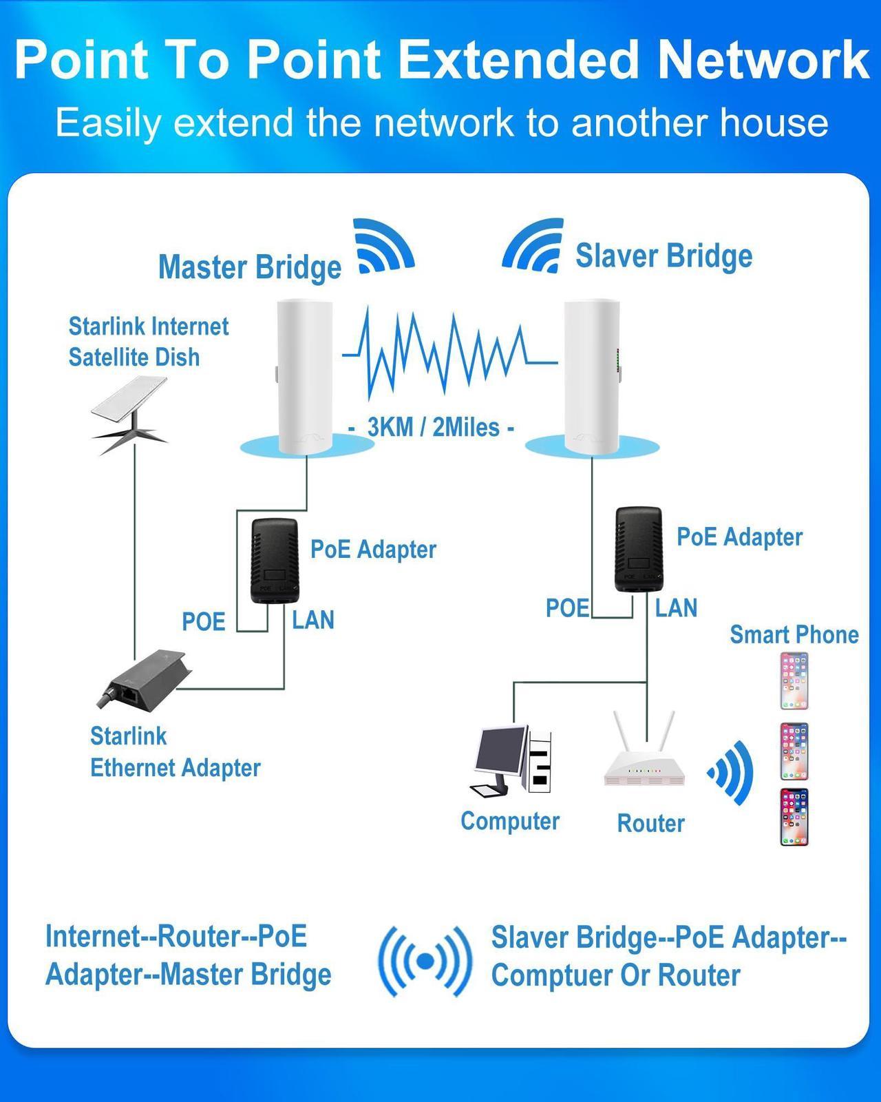 5.8G Wireless Bridge with Pole/Wall Mount Bracket – Extend Starlink Internet Access Outdoor, 2 Miles Point to Point WiFi Bridges with PoE Adapter, 2-Pack