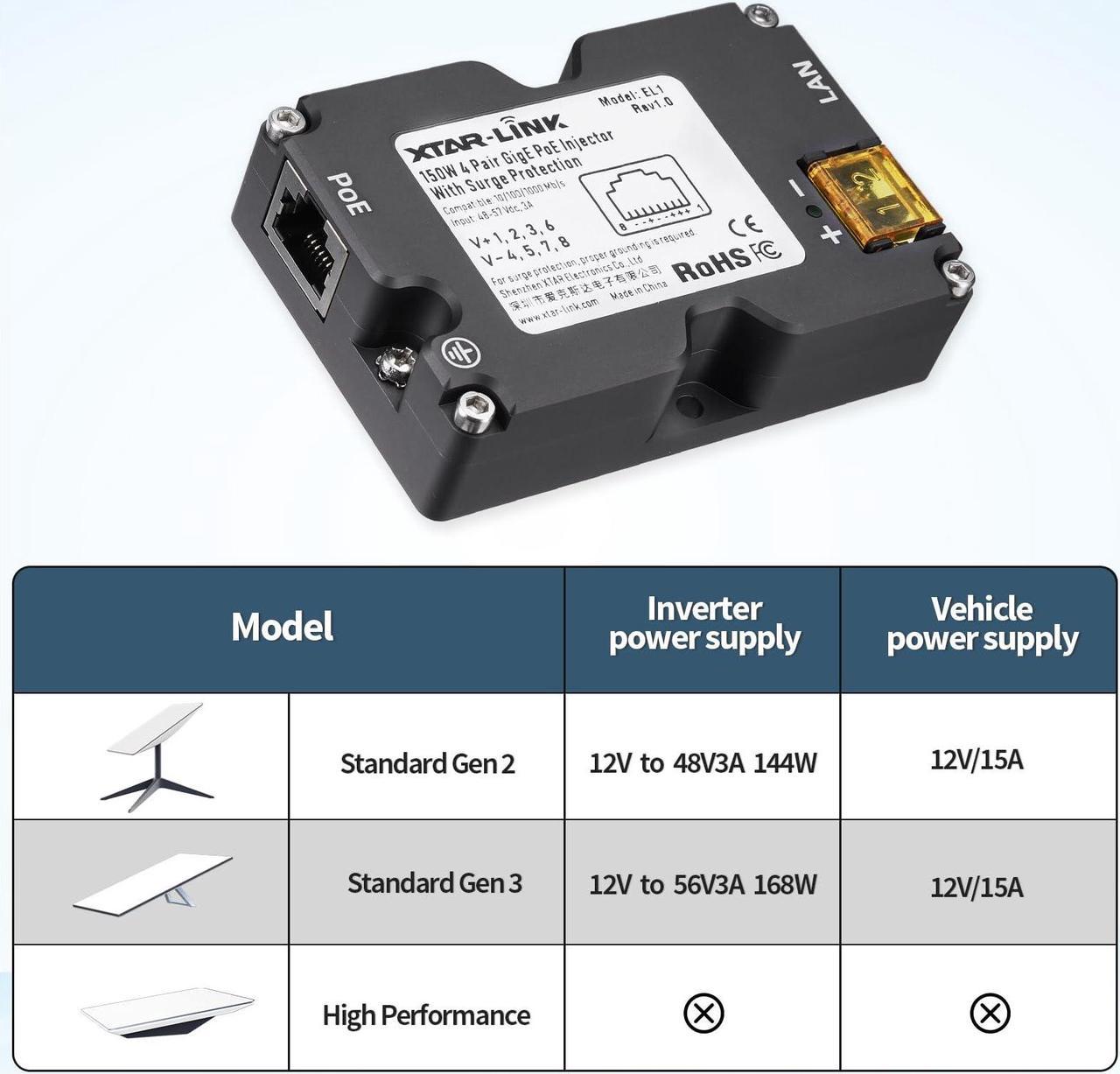 [(STABLE POWER DELIVERY)] The Starlink 150W PoeE Injector of stable power to ensure optimal performance of the Starlink Satellite Dish V2 [(FLEXIBLE POWER COMPATIBILITY)] The Starlink PoE injector easily connects to the network ports of a wide range of devices on one end and accepts 48V DC on the other, enabling efficient power supply for a wide range of devices. [(INTELLIGENT POWER MANAGEMENT)] 3A maximum input/output design ensures optimal power distribution while prioritizing safety and performance. [(ADAPTABLE HUMIDITY RESISTANCE)] With an operating humidity range of 10% – 90% (non-condensing), the cables are suitable for a wide range of environments as they maintain stability and functionality even under humid conditions. [You Will Get] 1* 150W Starlink PoE Injector ,1*Starlink Dishy V2 to RJ45 Adapter,1*Ethernet & 24 months friendly customer servic. Please contact us if you have any issue, we will reply and solve within 24 hours.