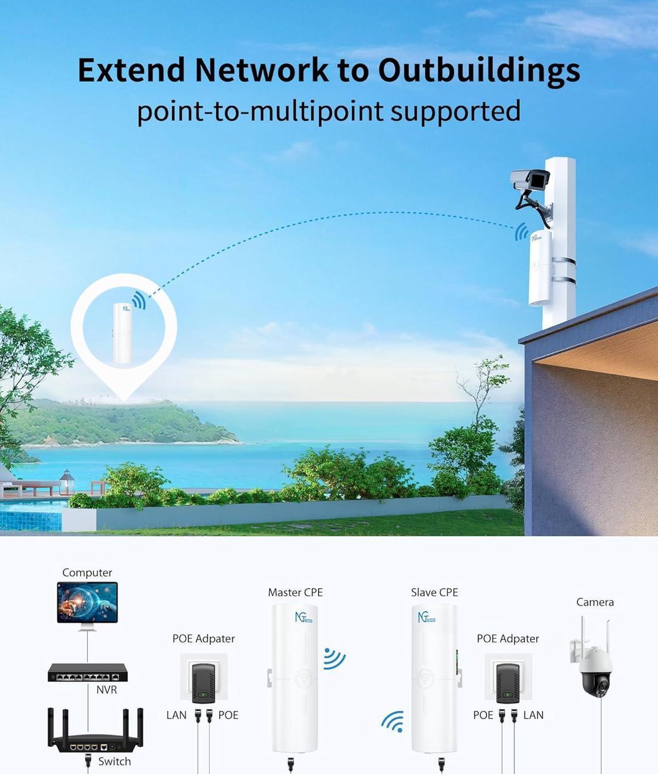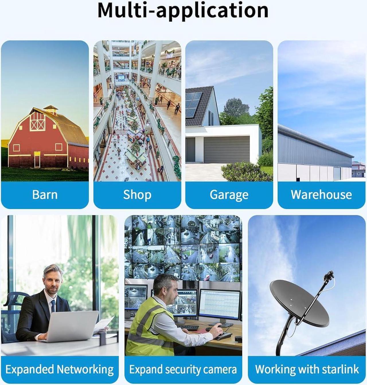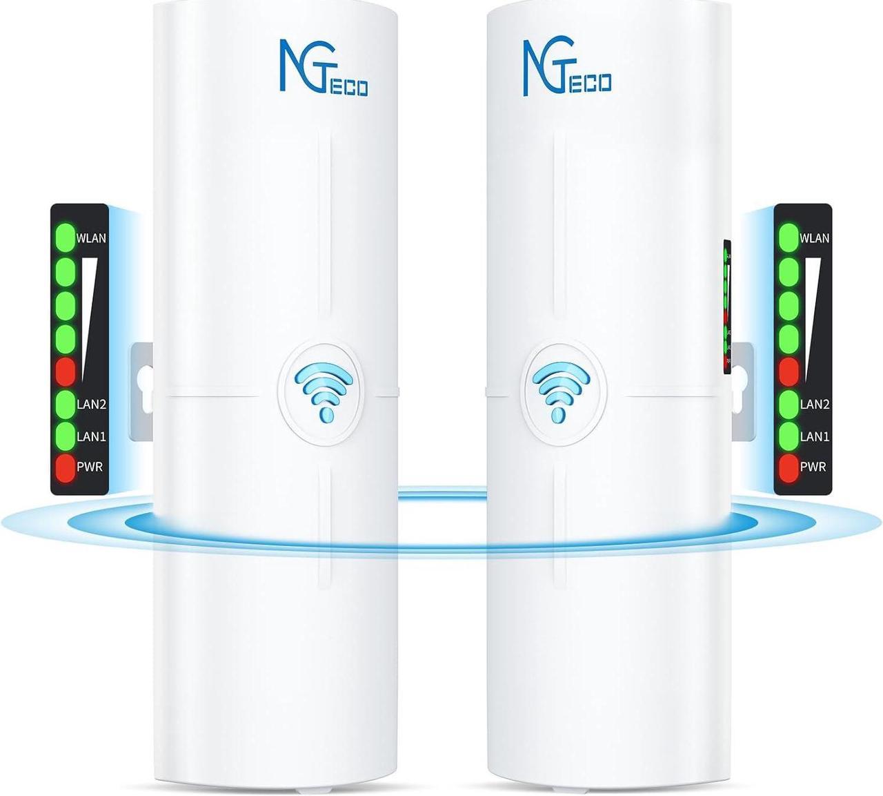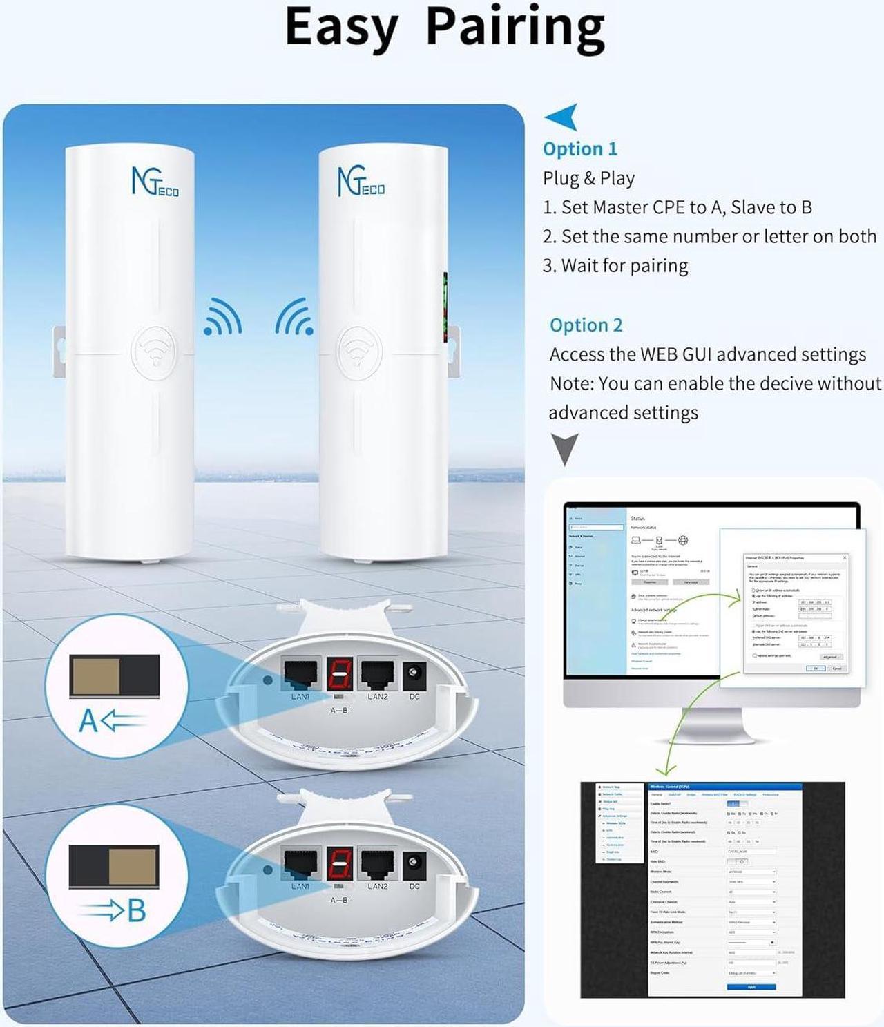 HIGH-SPEED TRANSMISSION: The 5.8 GHz wireless bridge features wireless transmission rates of up to 900 Mbps, delivering more than 150 Mbps of throughput. No need to lay wires or bury cables to realize fast and reliable network data transmission. 5KM LONG RANGE: The WiFi bridge is equipped with dual 14dBi high gain antennas with strong anti-interference ability, which can easily extend the network and surveillance coverage distance to 3-5KM buildings, barns, stores, farms, garages, warehouses, etc., which saves you subscription fees. DUAL ETHERNET PORTS: The point to point wireless bridge is equipped with 100/1000Mbps LAN ports, which can be paired with a variety of devices such as your security cameras, Starlink routers, access points, and network hubs for large-scale video and file transfers. EASY PAIRING: Our point to point outdoor wireless bridge comes out of the box with automatic pairing and snappy LEDs that eliminate the need to access the GUI and allow for easy pairing with