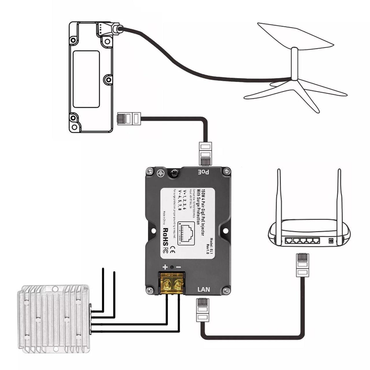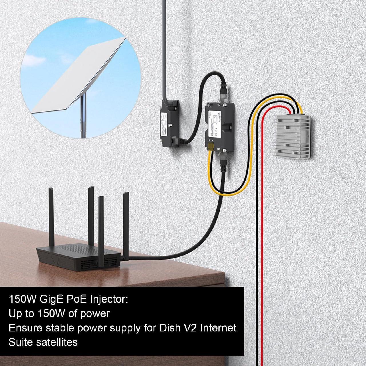 Uninterrupted Power Supply: Delivering up to 150W of power, the 150W GigE PoE Injector guarantees stable power supply to ensure connectivity for V2 Internet Kit. Flexible Connectivity and Efficient Power Management: Designed to connect the for V2 Internet kit to routers or desktops, laptops, offering enhanced flexibility with a maximum input output capacity of 3A to optimize power distribution for stable and efficient performance. Versatile Power Input and Comprehensive Safety: Featuring a 48-57V DC input range, this PoE injector accommodates standard for satellite cables and traditional cables for easy connection to computer ports, providing and discharge safety to ensure usage and prolong the lifespan of devices in various environments. RJ45 Adapter for Satellite: Connect the for Dish V2 to the PoE injector using the adapter to transmit data through the satellite Ethernet cable, allowing seamless integration with routers or desktops, laptops for enhanced connectivi