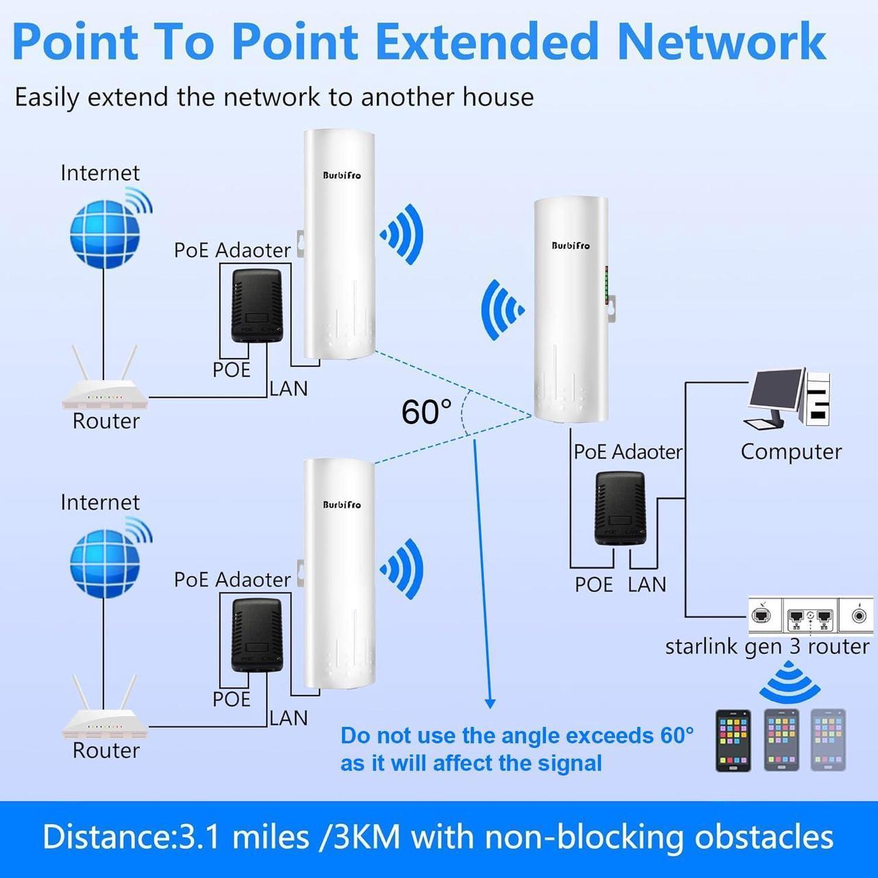 Long Range Capability: Utilizes the 5.8GH z frequency band to support long-range transmission up to 3km, providing reliable internet connectivity for Starlink Gen 3 routers and Starlink WiFi extenders. High-Speed Connectivity: Offers up to 100Mbps data transfer rates, ideal for bandwidth-intensive applications such as streaming, gaming, and large file transfers. IP65 Waterproof Design: Built with IP65-rated waterproof housing, ensuring durability and reliable operation in outdoor environments, including gardens, farms, resorts, and remote areas. Triple 18dBi High Gain Antennas: Each unit includes three 18dBi high gain antennas for enhanced signal strength, coverage, and stability in challenging outdoor conditions. Point to Multipoint Configuration: Supports a point to multipoint setup, enabling multiple connections from a single base station to remote client units, optimizing network deployment flexibility. Easy Installation: Designed for straightforward installation with included mounting hardware and setup guides, making it accessible for users without extensive technical expertise. Compatibility and Reliability: Compatible with Starlink Gen 3 devices and standard WiFi equipment, ensuring seamless integration and dependable performance over extended periods.