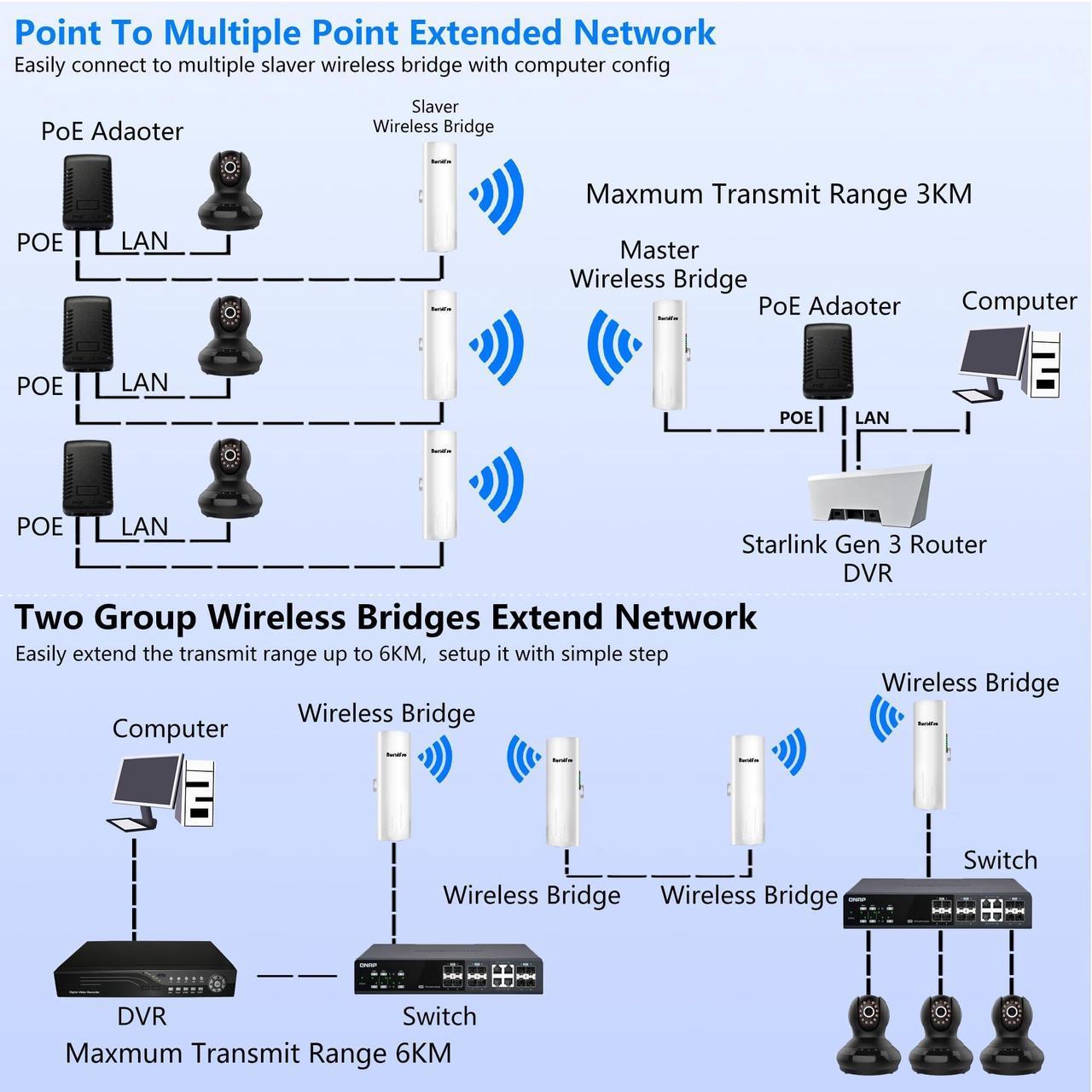 [Long Range Up to 3KM for Starlink Internet]: With a range of up to 3 kilometers outdoors, the Starlink Extender is well-suited for long-distance network bridging applications. Whether in rural areas, mountainous regions, or remote locations, users can easily access high-speed and stable network connections. This extensive coverage capability provides users with greater flexibility and convenience, enabling them to enjoy connectivity over a wider range. [Compatible with Starlink Gen 2 Ethernet Adapter or Gen 3 Router]: The point to point wireless bridge is compatible with Starlink’s second-generation Ethernet adapter and third-generation routers, facilitating seamless integration with the Starlink satellite internet system. Regardless of which generation of Starlink devices users have, they can achieve reliable network connections through this product, enjoying the convenience brought by Starlink satellite internet. [100Mbps High-speed Data Transmission for Starlink