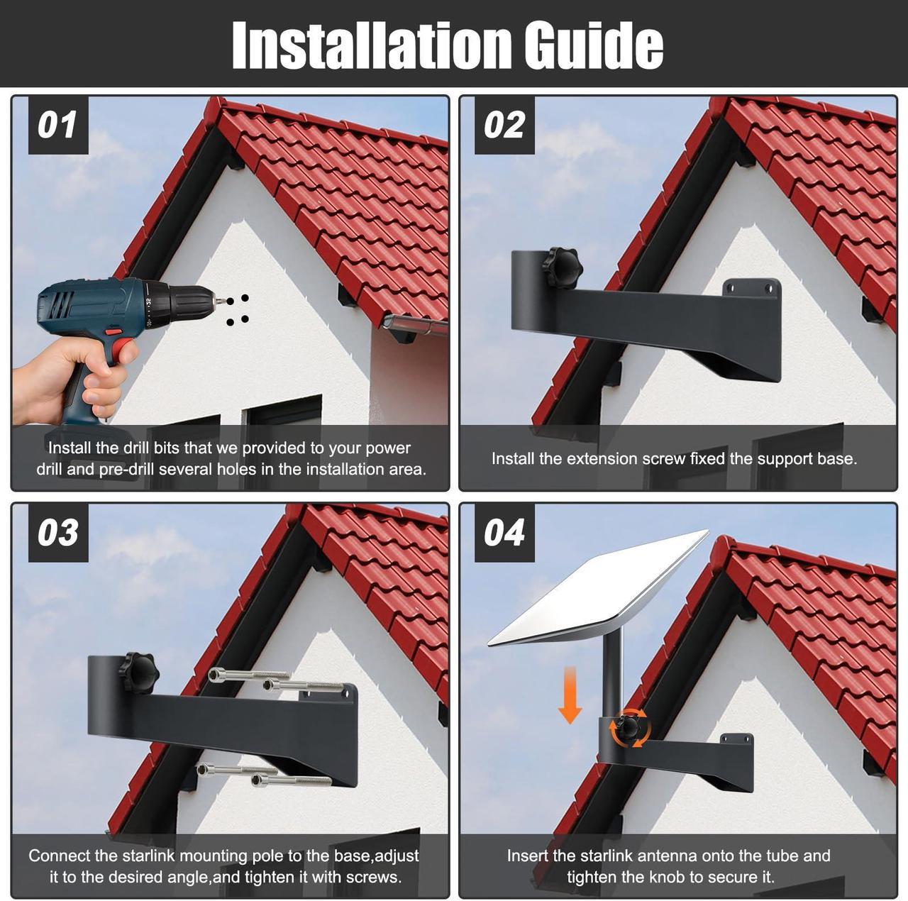 250mm Vertical Clearance to Get Over Your Gutter Line. Sturdy Construction, Unmatched Stability: Crafted from top-tier materials, our Starlink eave mount guarantees unwavering stability, even in the face of heavy winds. Feel secure knowing your rectangular antenna equipment rests on a robust foundation, ensuring optimal safety for your Starlink internet kit satellite. Precision in Every Detail: Our Starlink mount metallic material thickness is up to 0.2in, Built to withstand substantial weight, this Starlink roof mounting kit ensures a stable and secure installation of your valuable Starlink equipment. Versatile Installation: Our Starlink mounting kit includes a versatile drill bit compatible with wood, brick, and concrete walls. This adaptability ensures a secure installation on various surfaces, empowering you to choose the ideal location for your Starlink equipment. Simplicity Meets Efficiency: Installing your Starlink roof mount is a breeze, requiring just a f
